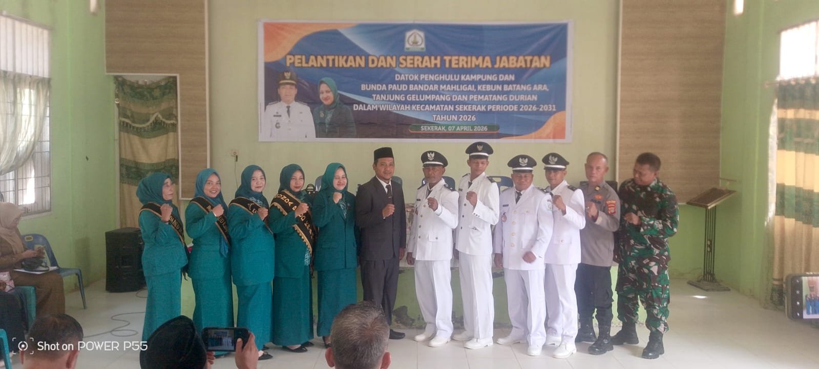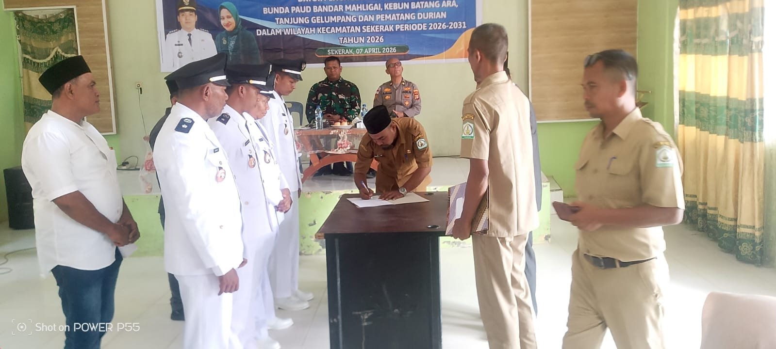 Kegiatan pelantikan dan serah terima jabatan empat datok penghulu dan Bunda PAUD, periode 2026 – 2031. yang di pimpin langsung oleh Camat sekerak Saftiyan Putra Ajatami, S.STP, di Aula kecamatan sekerak, Selasa, 7 April 2026.