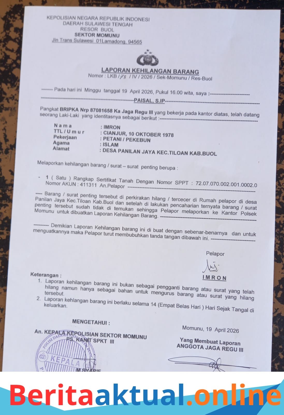 Dengan ini diberitahukan bahwa telah hilang satu rangkap Sertifikat Tanah Dengan Nomor SPPT:72.07.070.002.001.0002.0. Hak Milik atas nama IMRON, yang terletak Di Desa Panilan Jaya, Kecamatan Tiloan Kabupaten Buol Sulawesi Tengah, Sertifikat tersebut diduga hilang pada saat pemilik melakukan perjalanan dan hingga saat ini tidak ditemukan meskipun telah dilakukan upaya pencarian secara maksimal di berbagai lokasi tersebut.