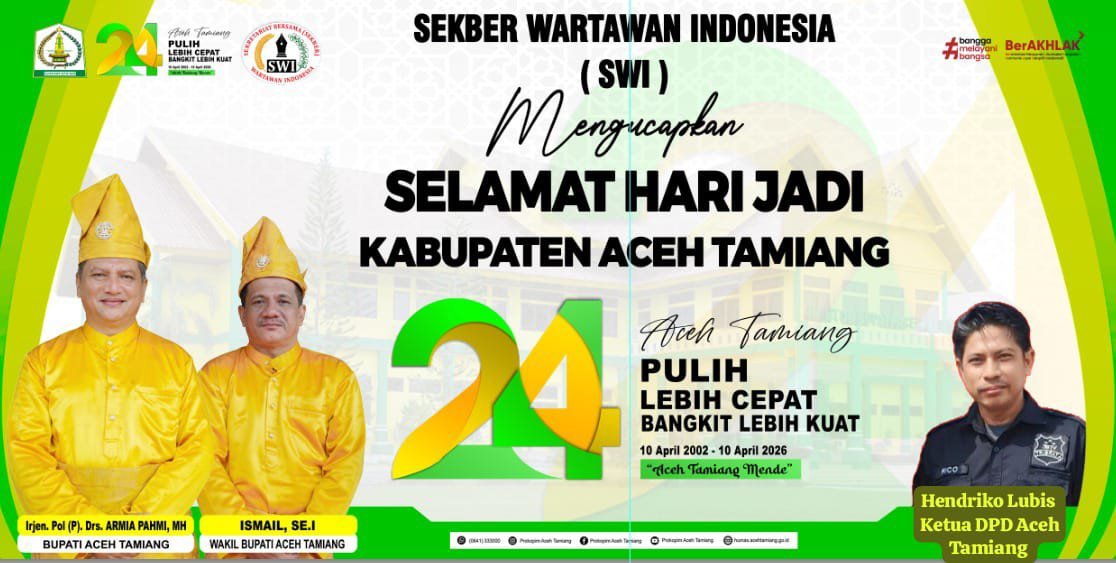 Dewan Pimpinan Daerah (DPD) Sekber Wartawan Indonesia (SWI) Aceh Tamiang, Hendriko Lubis, menyampaikan selamat atas Hari Jadi Kabupaten Aceh Tamiang yang ke-24.