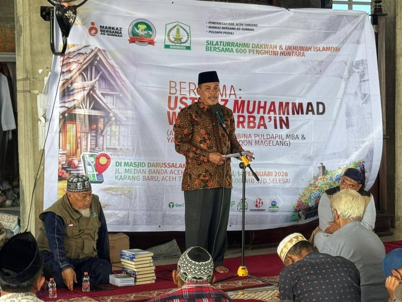 Plt. Sekretaris Daerah Kabupaten Aceh Tamiang, Drs. Syuibun Anwar, mewakili Bupati Aceh Tamiang menghadiri kegiatan Silaturahmi Dakwah dan Ukhuwah Islamiyah bersama 600 penghuni Hunian Sementara (Huntara) Kampung Simpang IV, Kecamatan Karang Baru, Sabtu (14/02/26).