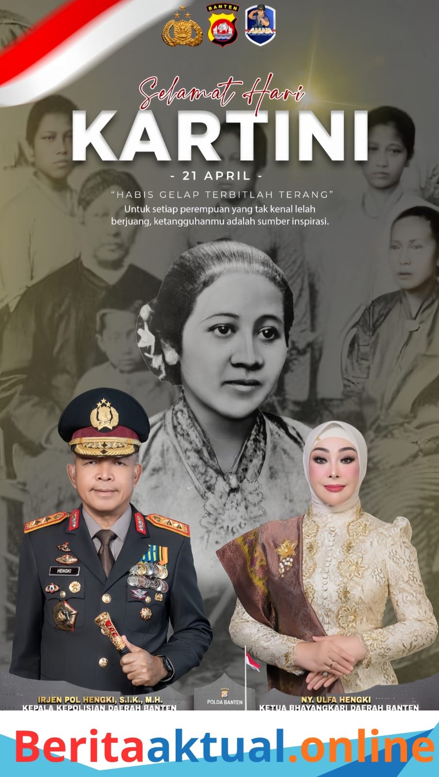 Dalam rangka memperingati Hari Kartini yang jatuh pada 21 April 2026, Kapolda Banten Irjen Pol. Hengki, bersama Wakapolda Banten Brigjen Pol. Dr. Hendra Wirawan, beserta jajaran staf dan Bhayangkari, menyampaikan ucapan selamat kepada seluruh perempuan Indonesia.