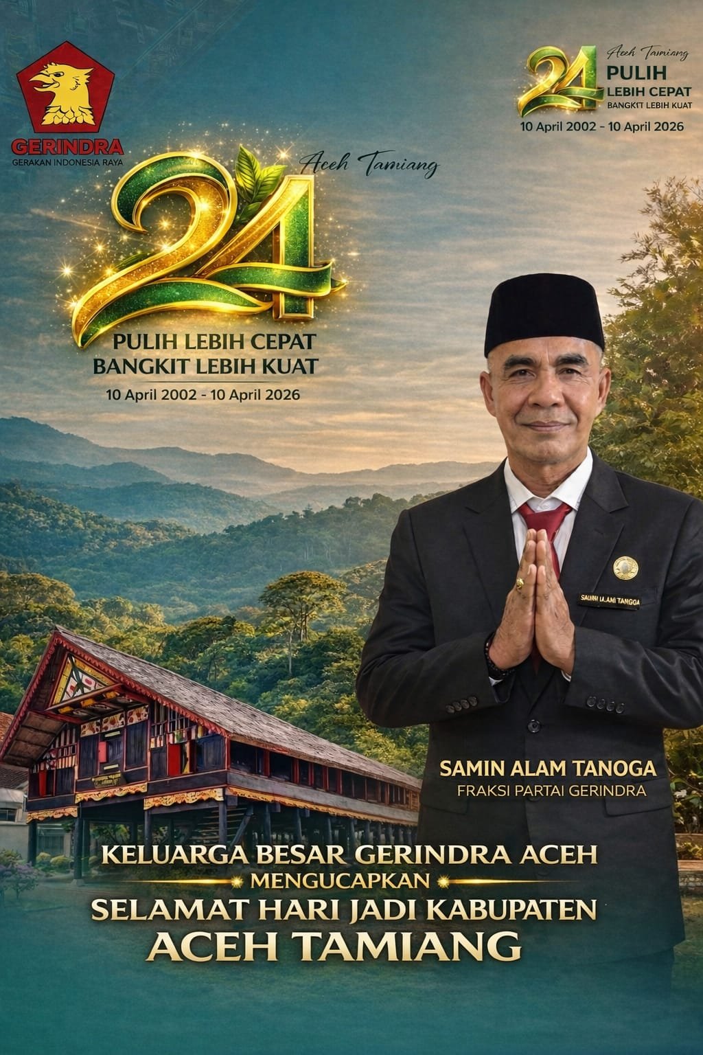 “Kami dari Fraksi Gerindra dan seluruh Keluarga Besar Gerindra Aceh mengucapkan selamat Hari Jadi ke-24 Kabupaten Aceh Tamiang. Semoga ke depan semakin maju, mandiri, dan sejahtera,” ujar Samin Alam Tanoga.