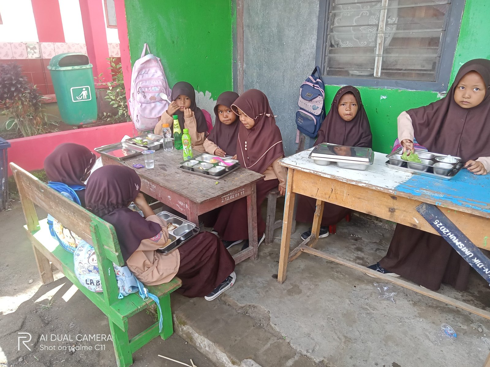 Para siswa tampak sangat senang dan tertib saat menerima jatah makan mereka masing-masing. Mereka duduk berbaris rapi di ruang kelas maupun halaman sekolah, menikmati hidangan dengan lahap.