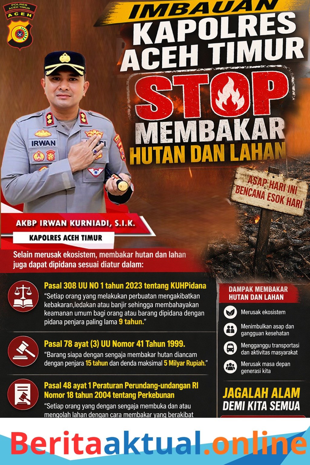 Kapolres Aceh Timur AKBP Irwan Kurniadi, S.I.K. mengajak seluruh masyarakat untuk tidak melakukan pembakaran lahan dalam bentuk apa pun. Selain itu, warga juga diimbau untuk segera melaporkan apabila menemukan titik api atau indikasi kebakaran di lingkungan sekitar.